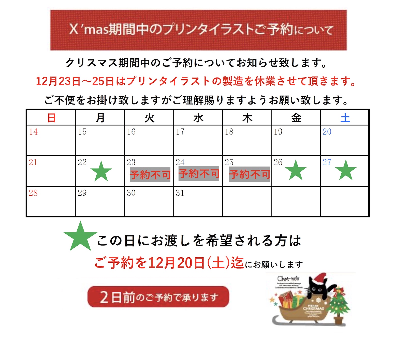 X’mas期間中のプリンタイラストご予約について