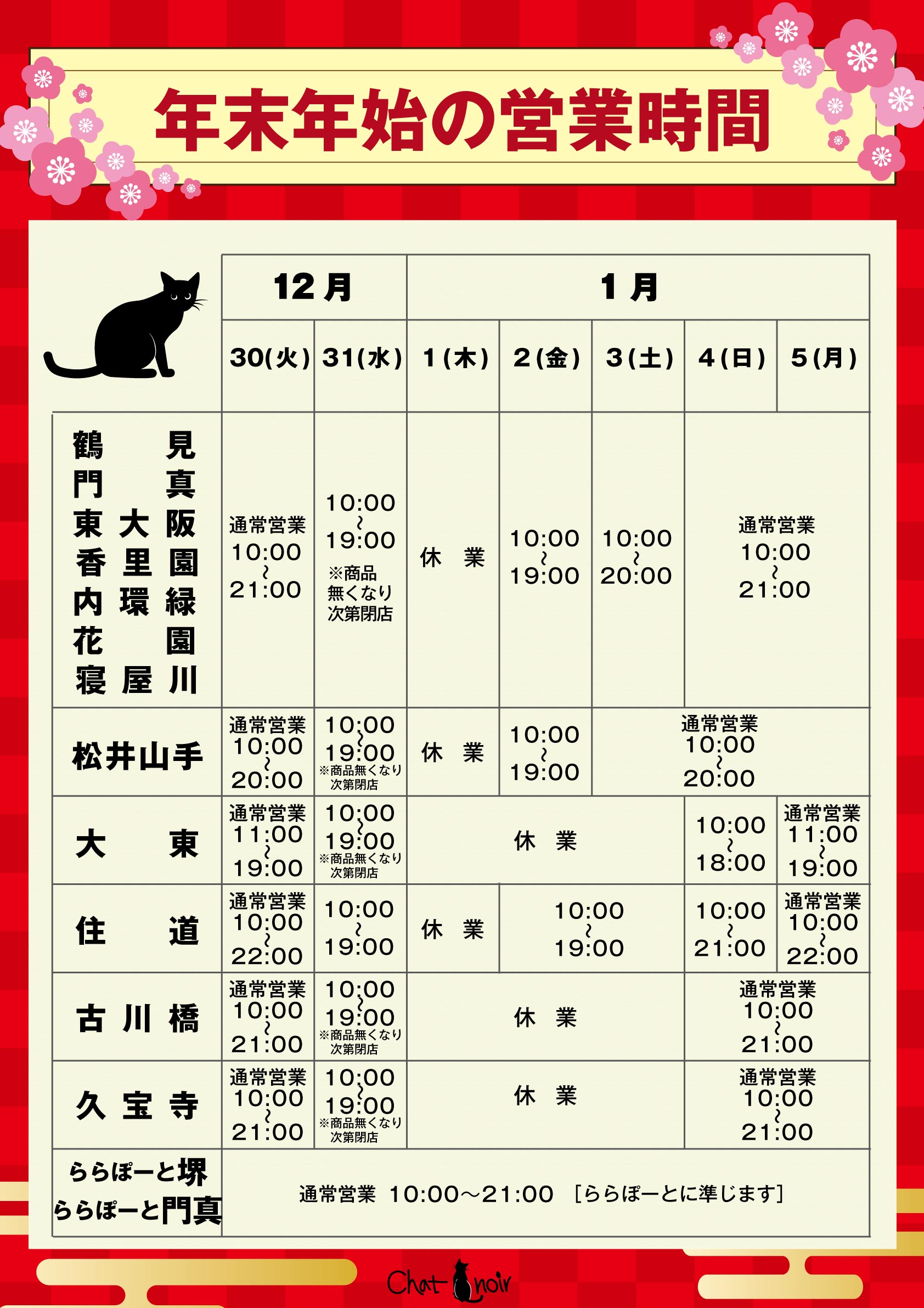 年末年始営業時間のご案内